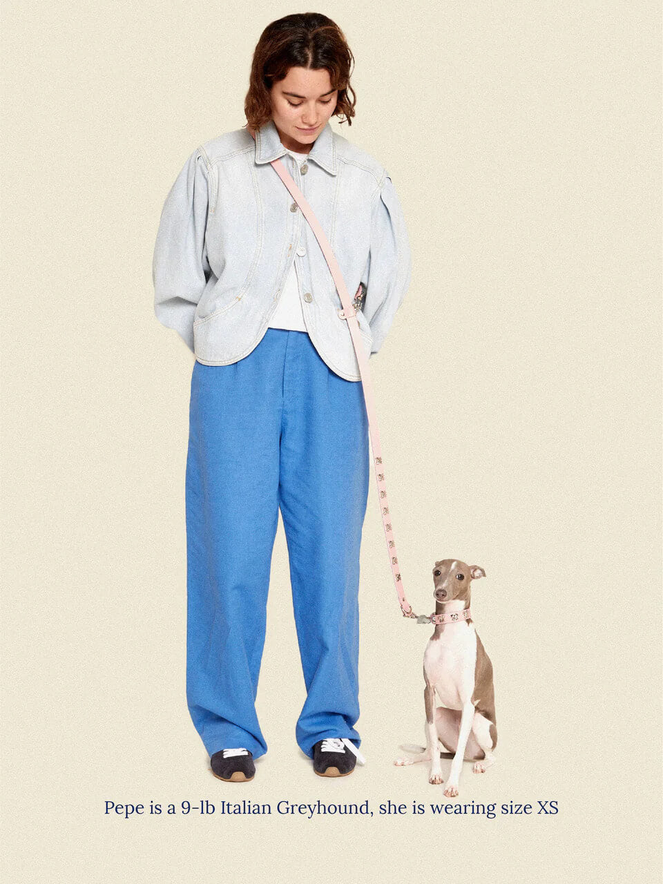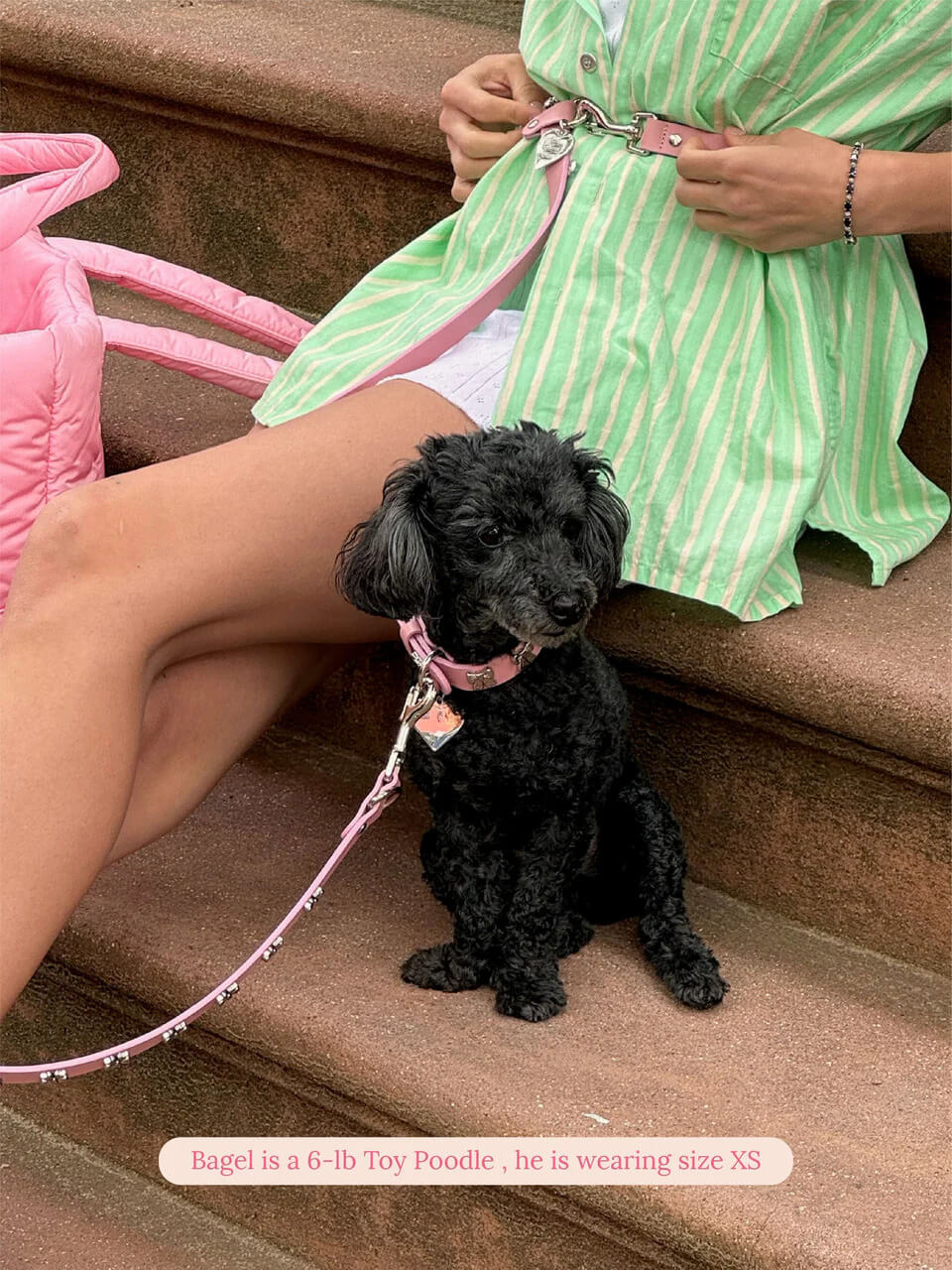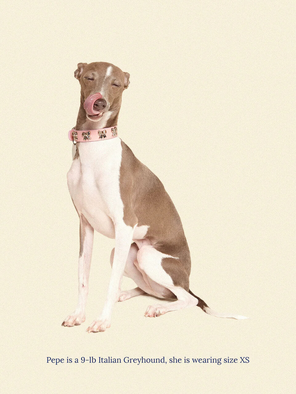 We teamed up with Ian Charms to make the prettiest, classiest, most elegant collar for your princess or prince, pup. so sophisticated. it's like giving breakfast at tiffany's type of vibe. BTW, these collars are individually handmade. We cut each piece from a single piece of Italian Vegetable Tanned leather and hand press each stud into place. We work with a family-owned leather production shop thatβs been around for over thirty years. We do not mass produce these so each piece is truly one of a kind.Β