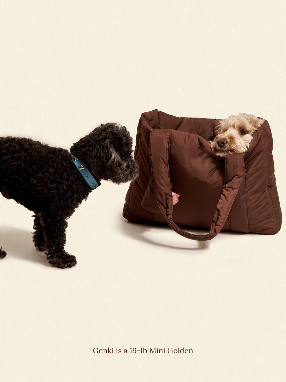 Our signature puffy carrier is super lightweight, airy, and breathy. Also it's super versatile, we sometimes even use it as a regular ol' bag to carry all our stuff. With this super cute carrier, please feel free to take your pups everywhere. Take them on the subway or on the bus, to the store, or wherever you need to go. FYI though - technically, this is not TSA compliant because it doesn't have a mesh top and it's a bit bigger. This carrier also comes with a matching poop bag holder...CUUUUUTE.