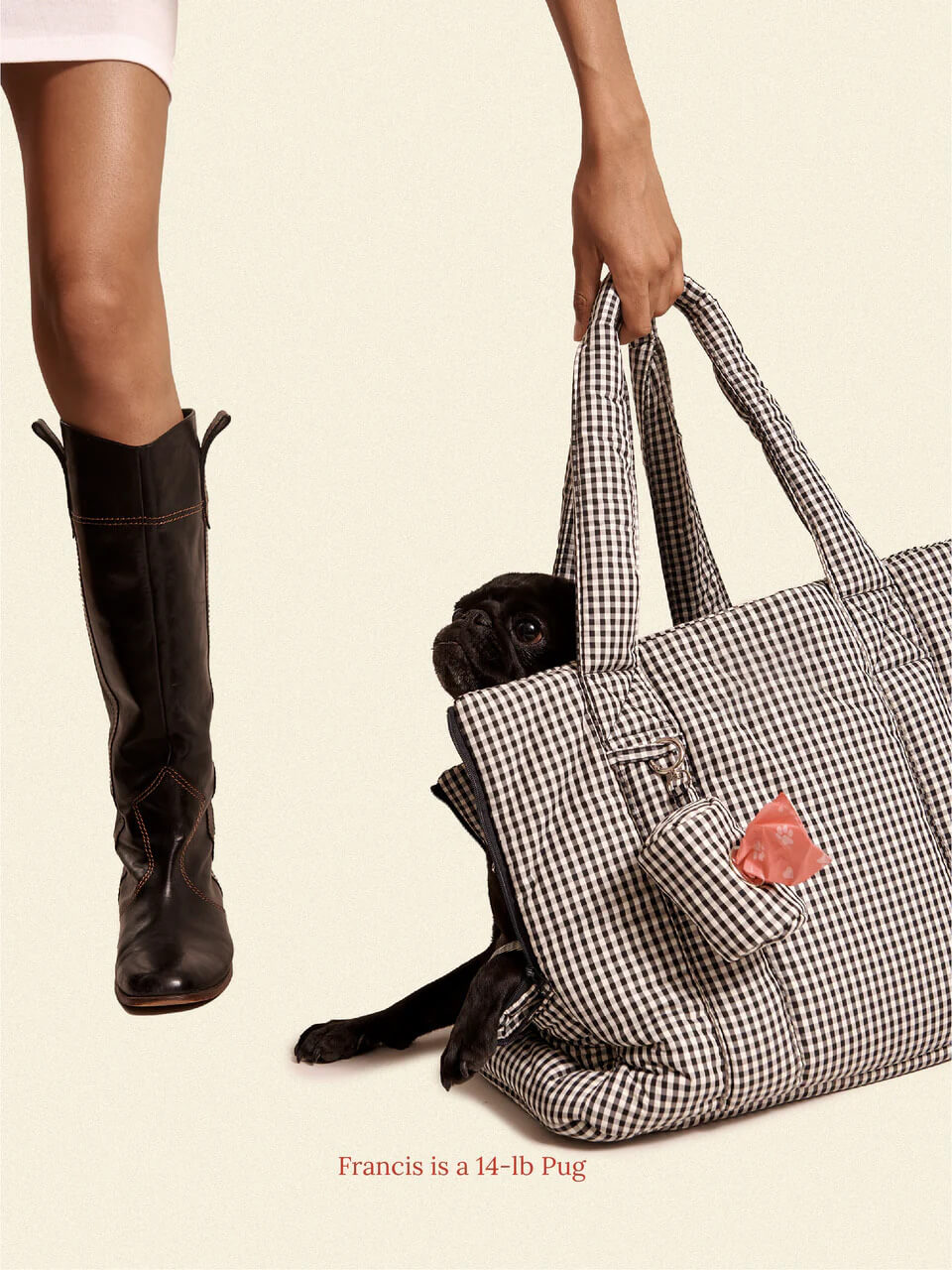 Our signature puffy carrier is super lightweight, airy, and breathy. Also it's super versatile, we sometimes even use it as a regular ol' bag to carry all our stuff. With this super cute carrier, please feel free to take your pups everywhere. Take them on the subway or on the bus, to the store, or wherever you need to go. FYI though - technically, this is not TSA compliant because it doesn't have a mesh top and it's a bit bigger. This carrier also comes with a matching poop bag holder...CUUUUUTE.