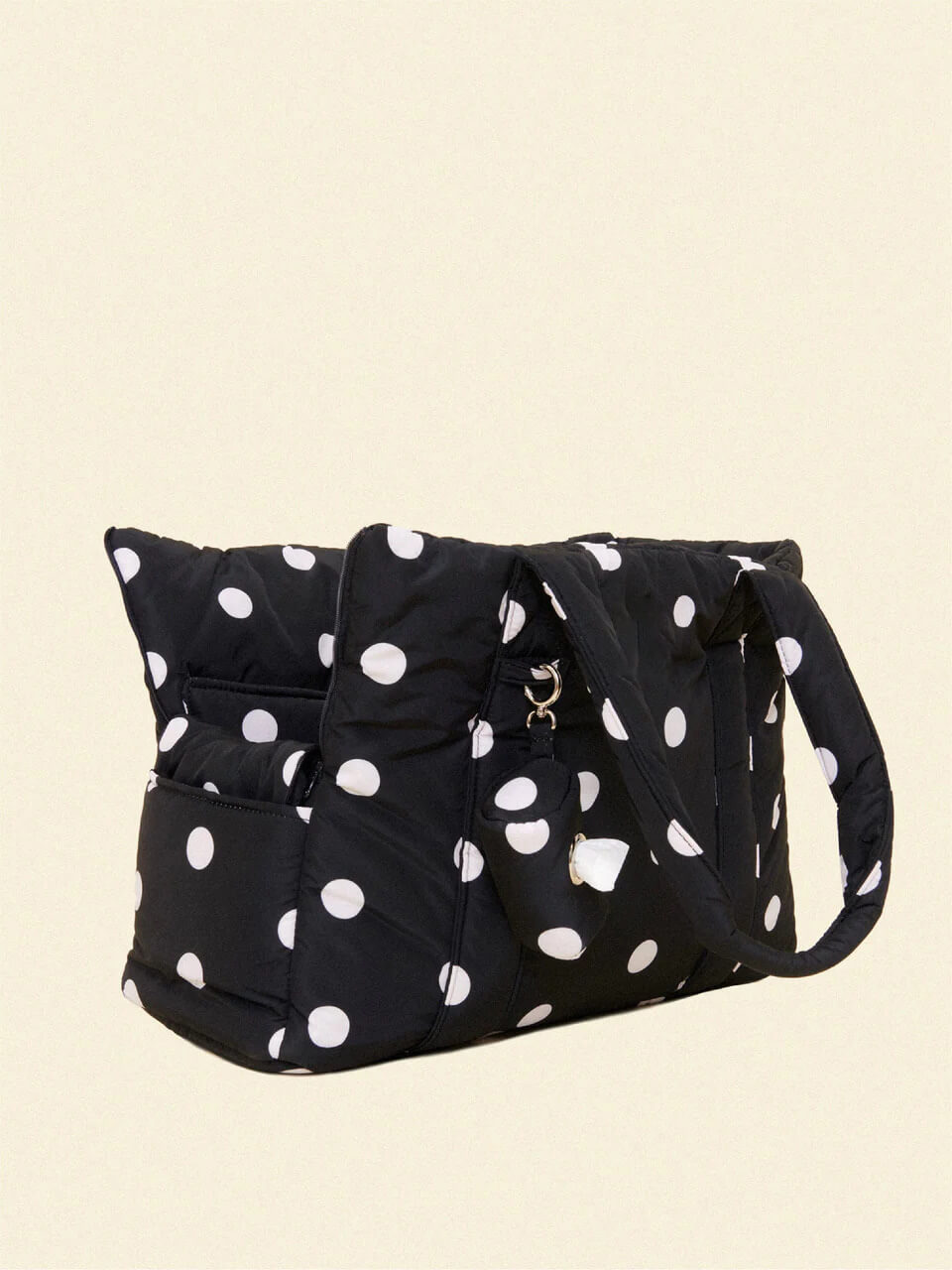Light, easy to wash and water-resistant fabric. Soft padding and sturdy bottom. Strong handles but soft and comfortable on shoulders. Lots of pockets. Removable poop bag holder. Side zippers to open and close when needed. Safety hook.